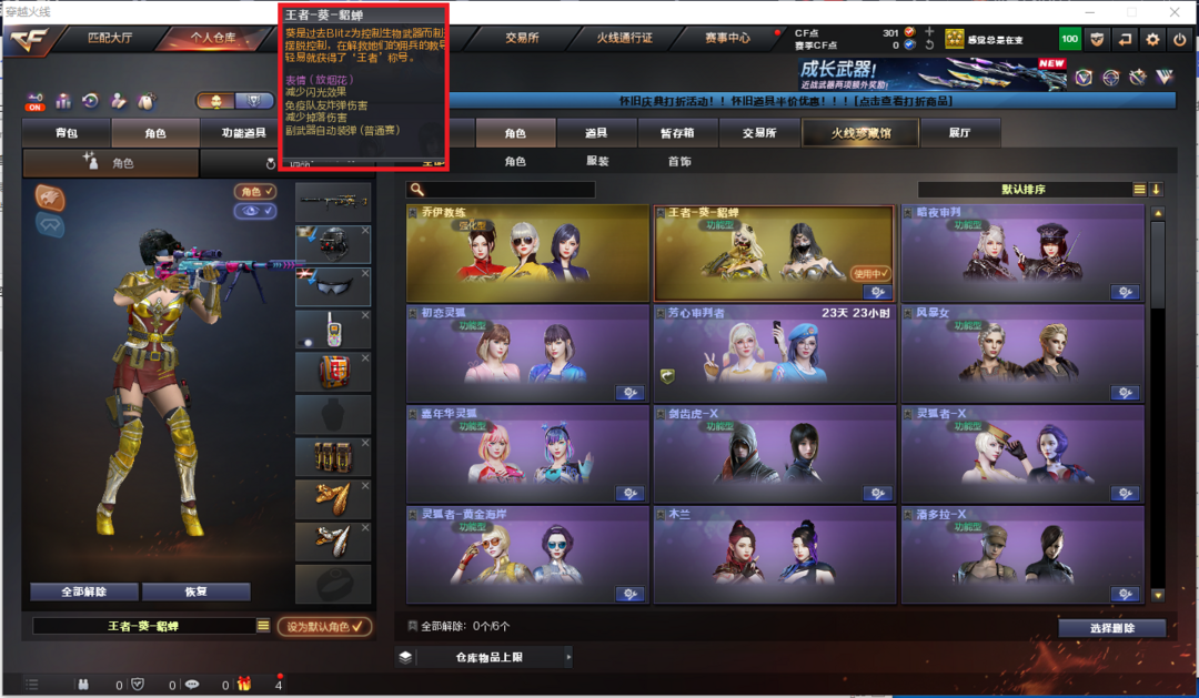 排位:可以、、、、、、、、爆破四防:幻神3皮+音效(白鲨、青鹤、黄忠皮肤)、3个USP神工天巧、冠军之特、、、、传说夜影、白虎之魄、QBZ冠军之薇、2把炽芒蝶刃、、、幻神音效、毁灭音效、、、9套神工天巧、、、爆破四防(王者貂蝉)