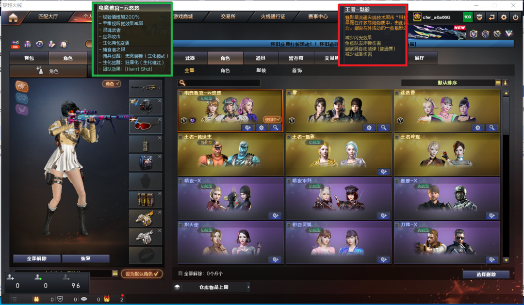 排位:可以、、、、、、、、、、爆破四防:幻神2皮(白鲨、黄忠皮肤)王者幻神、M200-竞技荣光、98K星神、、、、、USP雷暴、2个COP堕天神、世冠柯尔特、柯尔特竞技荣光、白虎、QBZ冠军之薇、、、白虎音效、毁灭音效、火麒麟音效、、、1套雷暴、7套堕天神、2套夜魔、1套幻灵、2套竞技荣光、、、爆破四防(云悠悠、王者魅影)
