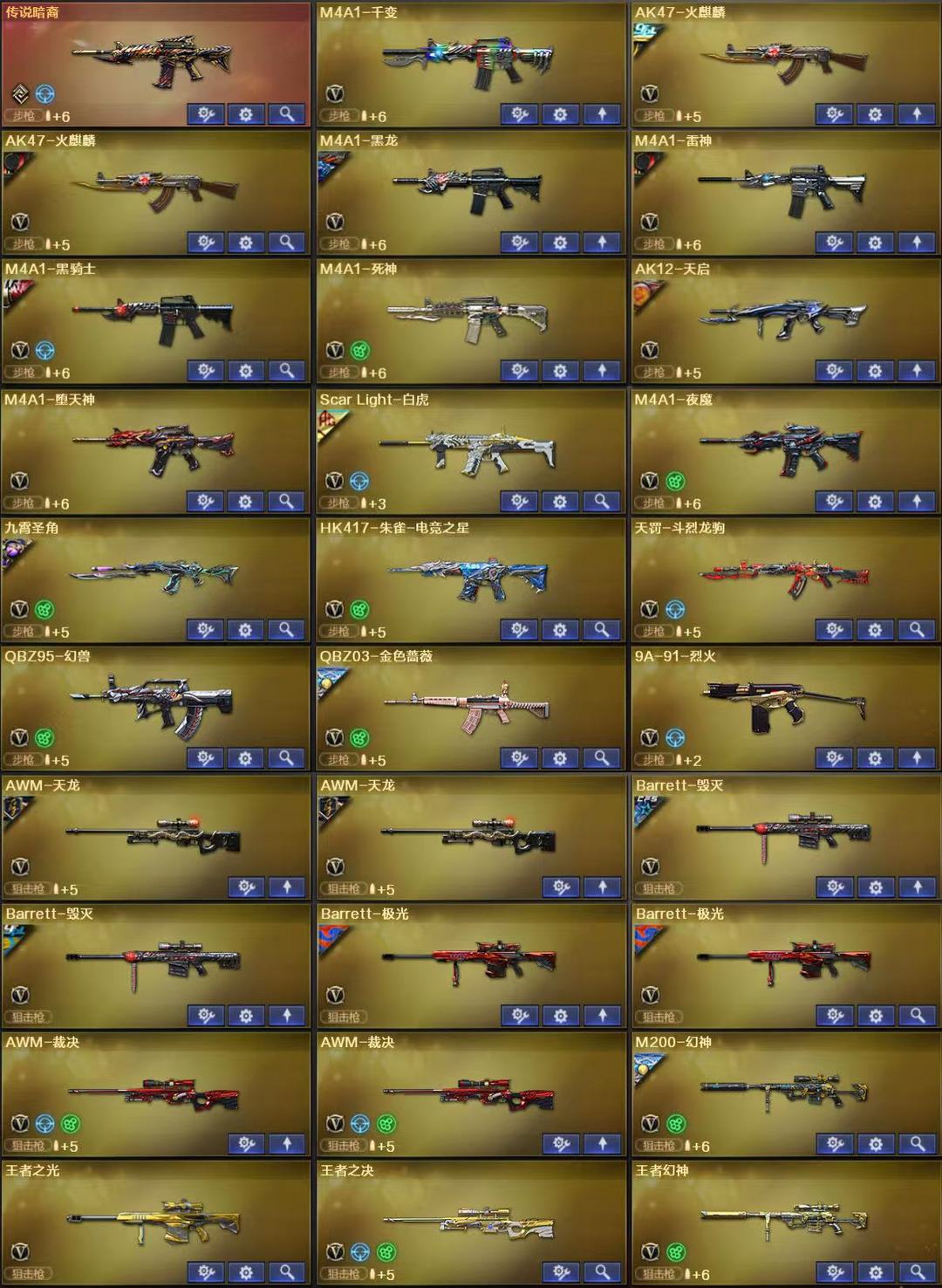 本游戏账号:英雄武器94个; 王者武器15个。 装备不多,但是主武器、副武器、近身武器够用 拥有完美游戏体验。重要的是,特殊装备有:传说辉光、柯尔特-荣耀世冠白鲨2023、Kar98K-星神、雷霆之契、Scar Light-白虎、USP-雷暴、高爆手雷-竞技荣光、闪光弹-竞技荣光、烟雾弹-竞技荣光、擎天-竞技荣光、柯尔特-竞技荣光、M200-竞技荣光、M4A1-黑骑士、麒麟刺-堕天神、烟雾弹-堕天神、闪光弹-堕天神、M200-幻神、M4A1-雷神、AK47-火麒麟、麒麟刺、QBZ03-金色蔷薇、AA-12-雷霆、M4A1-黑龙、Barrett-毁灭、加特林-炼狱、AWM-天龙、QBZ95-幻兽、沙鹰-幻兽、炫金超新星、王者幻神-觉醒版、高爆手雷-雷霆王者、王者之怒-觉醒版、王者之锋-觉醒版、王者之魄高爆手雷、王者之魄烟雾弹、王者之魄闪光弹、王者之魄-觉醒版、炫金黑龙、潘多拉、堕天使、职业选手、王者涂鸦、圣诞潘多拉-X、王者潘多拉、AK47-火麒麟音效卡、生化弹匣、QBZ03-金色
