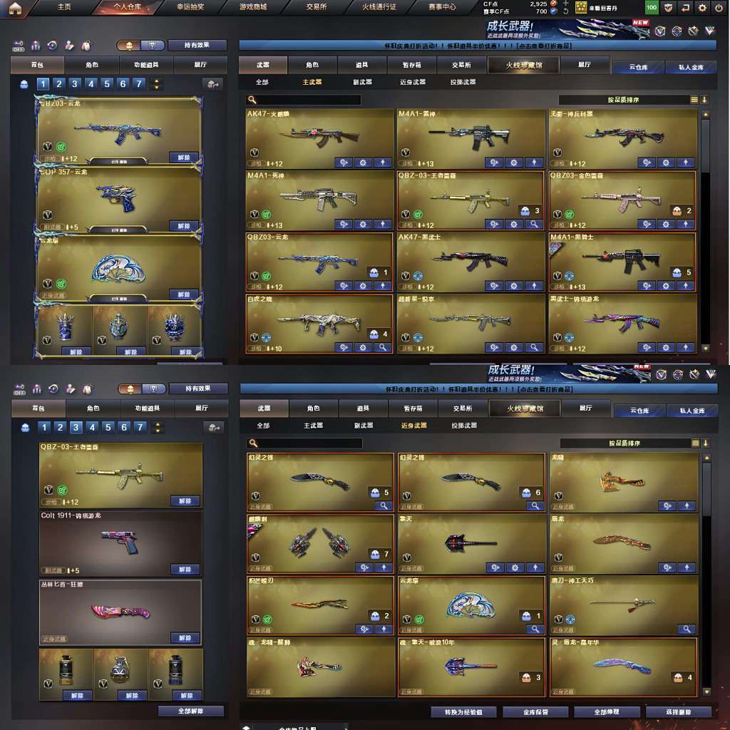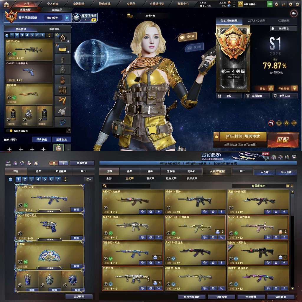本游戏账号:英雄武器39个; 王者武器 5 个。 装备齐全拥有完美游戏体验。重要的是,特殊装备有:M4A1-黑骑士、AK47-黑武士、麒麟刺、AK47-火麒麟、AWM-天龙、Barrett-毁灭、加特林-炼狱、M4A1-雷神、QBZ03-金色蔷薇、M200-幻神、幻灵之锋、唐刀-神工天巧、QBZ-03-王者蔷薇-觉醒版、王者之光-觉醒版、加特林-炼狱星空皮肤、王者之烈-觉醒版、白虎之魄-觉醒版、王者之光-觉醒版、炽芒蝶刃、末日战神投影、灵狐者-职业经理4防、魅影、王者涂鸦4防、王者-春4防、裁决百城联赛皮肤、M4A1-黑骑士音效卡等,还有各种玩偶随意畅选。