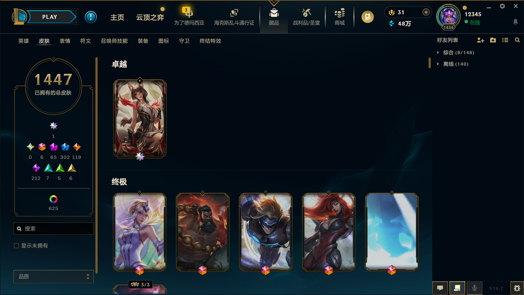 全英雄❤1447原皮肤❤625炫彩 可排位别骂人谢谢