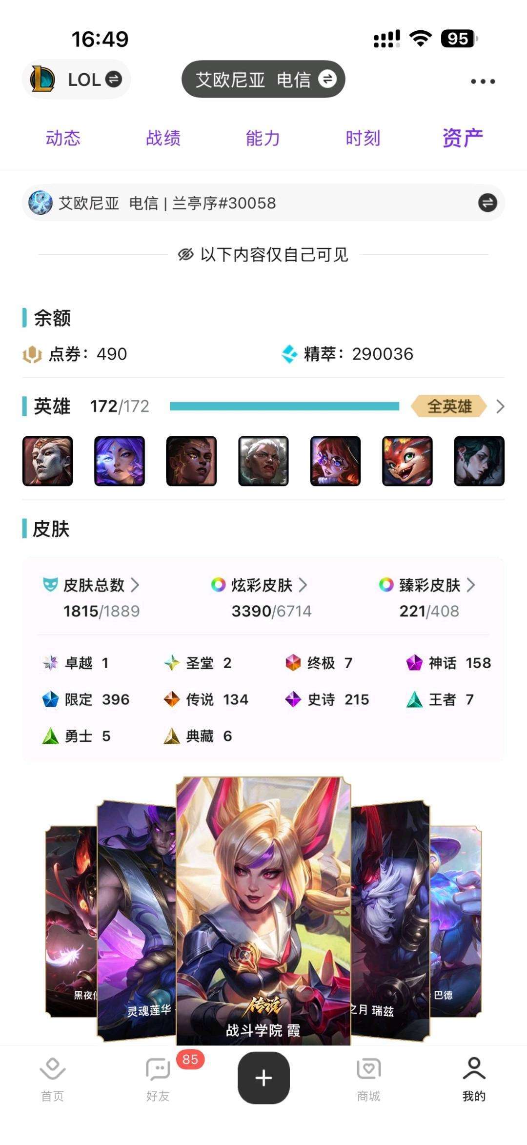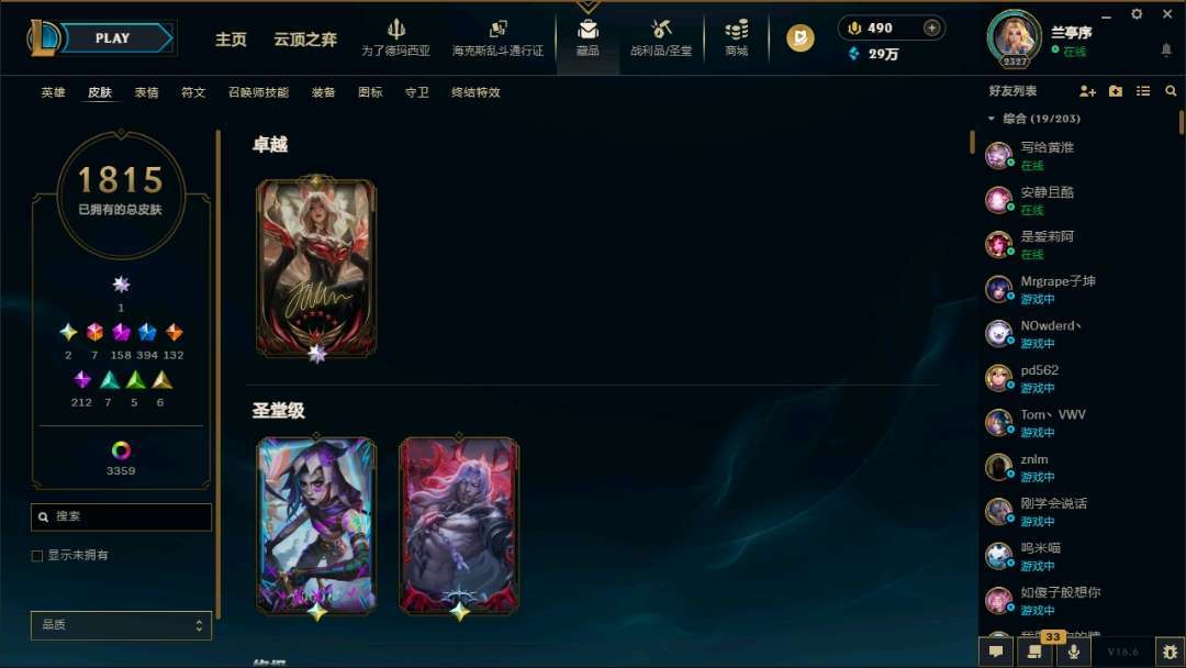 艾欧尼亚5200皮丨1815原皮丨签名阿狸双圣堂丨10幻想丨3390炫彩丨221臻彩丨396限定