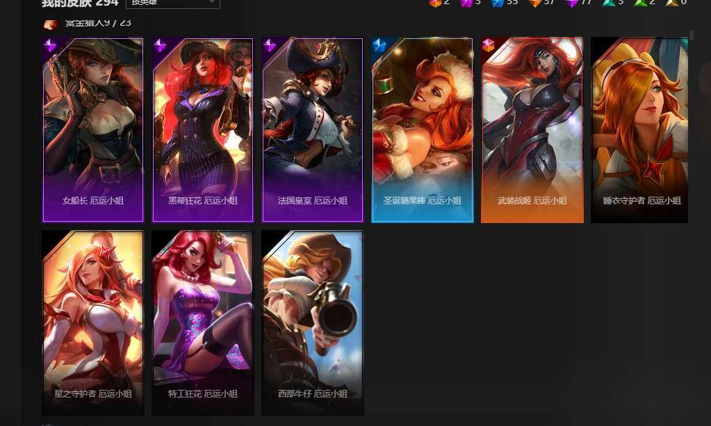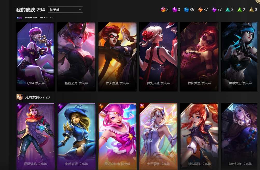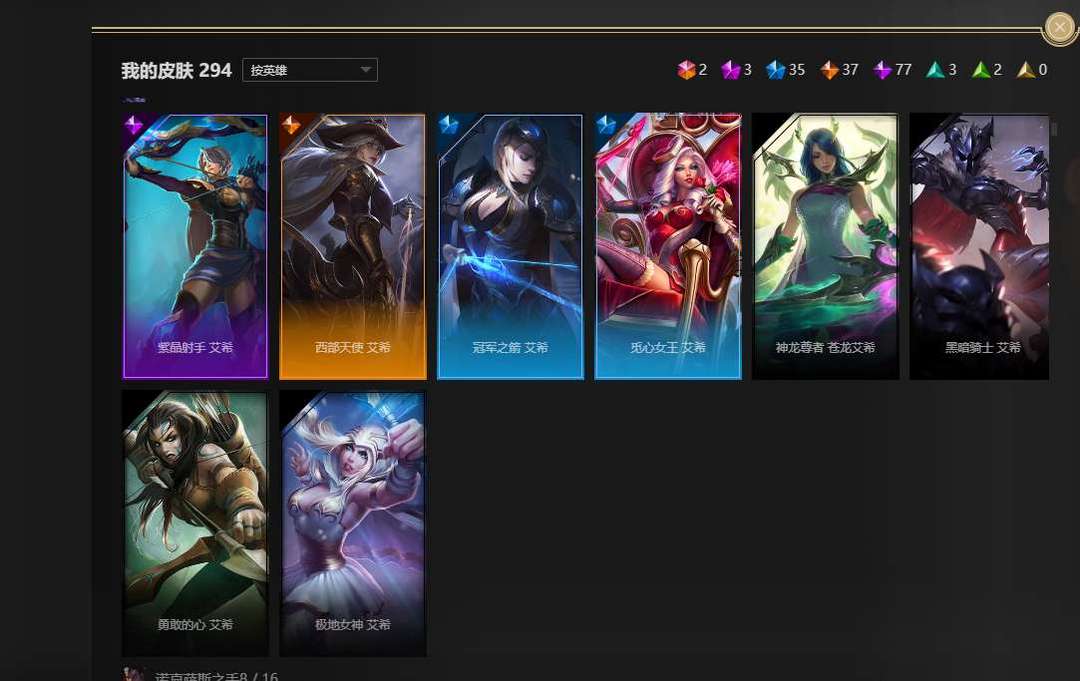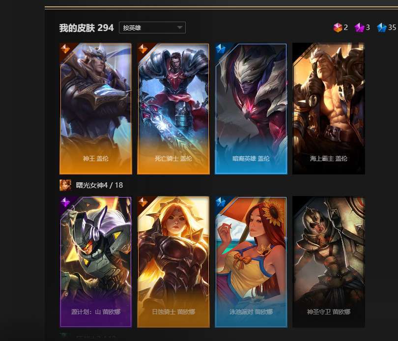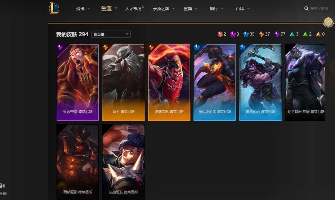 全英雄,2终极,3神话,35限定,77史诗,神王盖伦诺手大元素使光辉,暗夜使者亚索,武装战姬厄运小姐