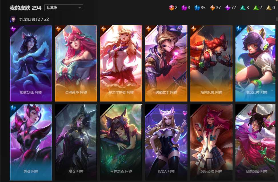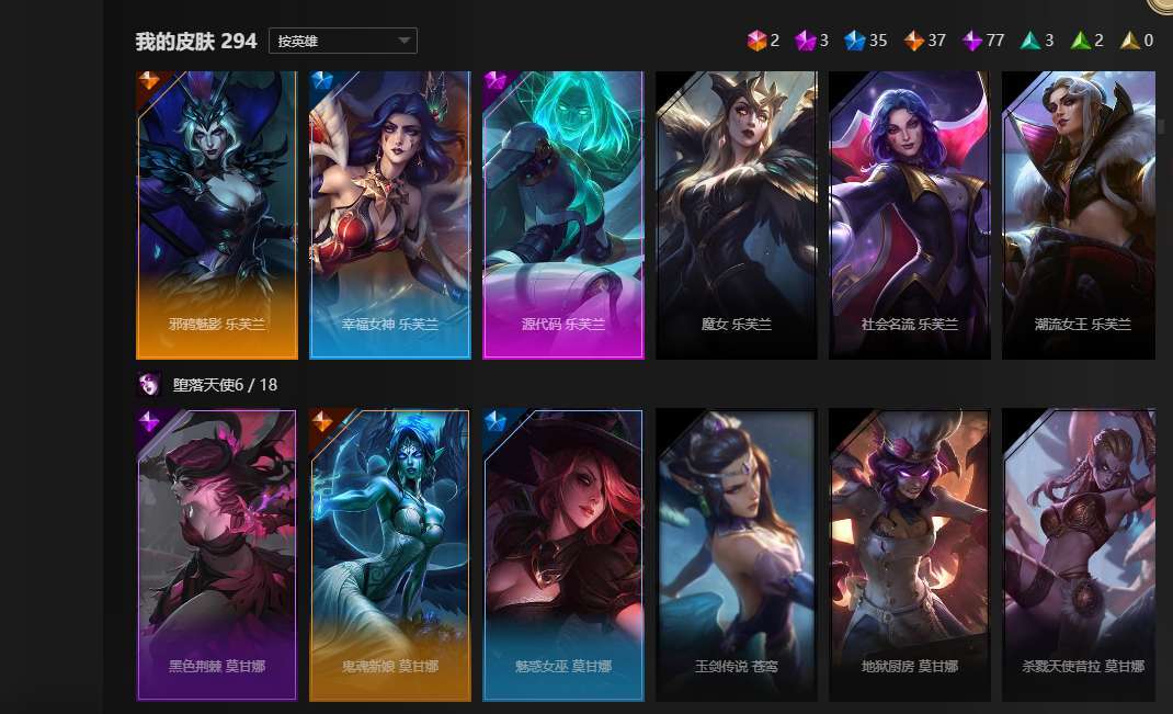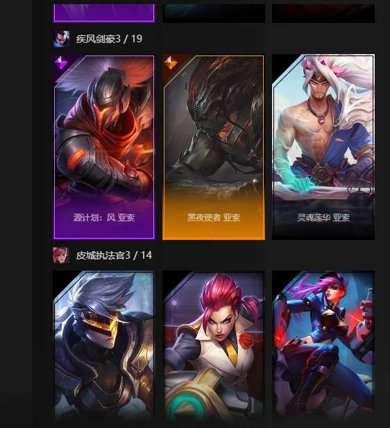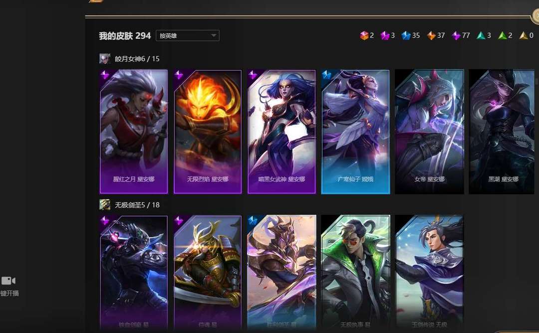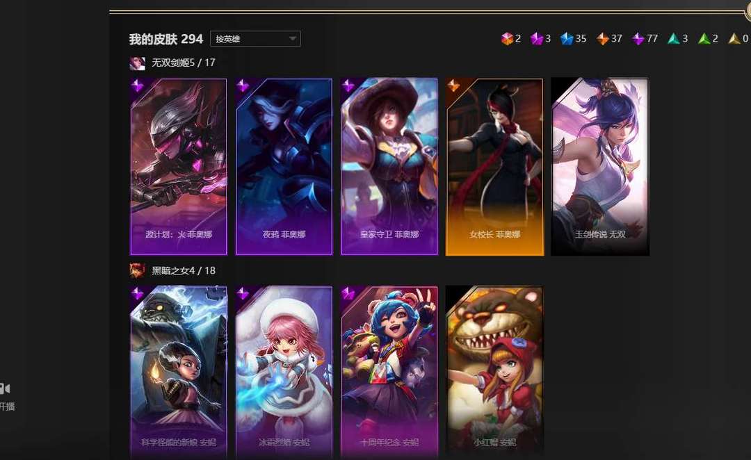 全英雄,2终极,3神话,35限定,77史诗,神王盖伦诺手大元素使光辉,暗夜使者亚索,武装战姬厄运小姐