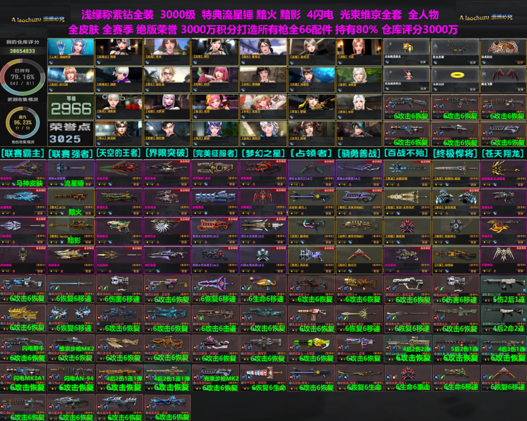 电一浅绿称,紫钻特权全武器。全传奇。,马神皮肤、雷索流星锤、黯火、特典狙-黯影、闪电MG36、闪电MK3A1、野牛、94。光束步枪123,维京步枪全套。3000级。荣誉点3100点,很多绝版荣誉。全赛季。三千万积分打造顶级配件,超多皮肤枪。 A佬出租欢迎你的光临!喜欢请收藏店铺,店铺里下单可领红包。 【已去黑雾,画面优化,画质清晰。【欢迎收藏】