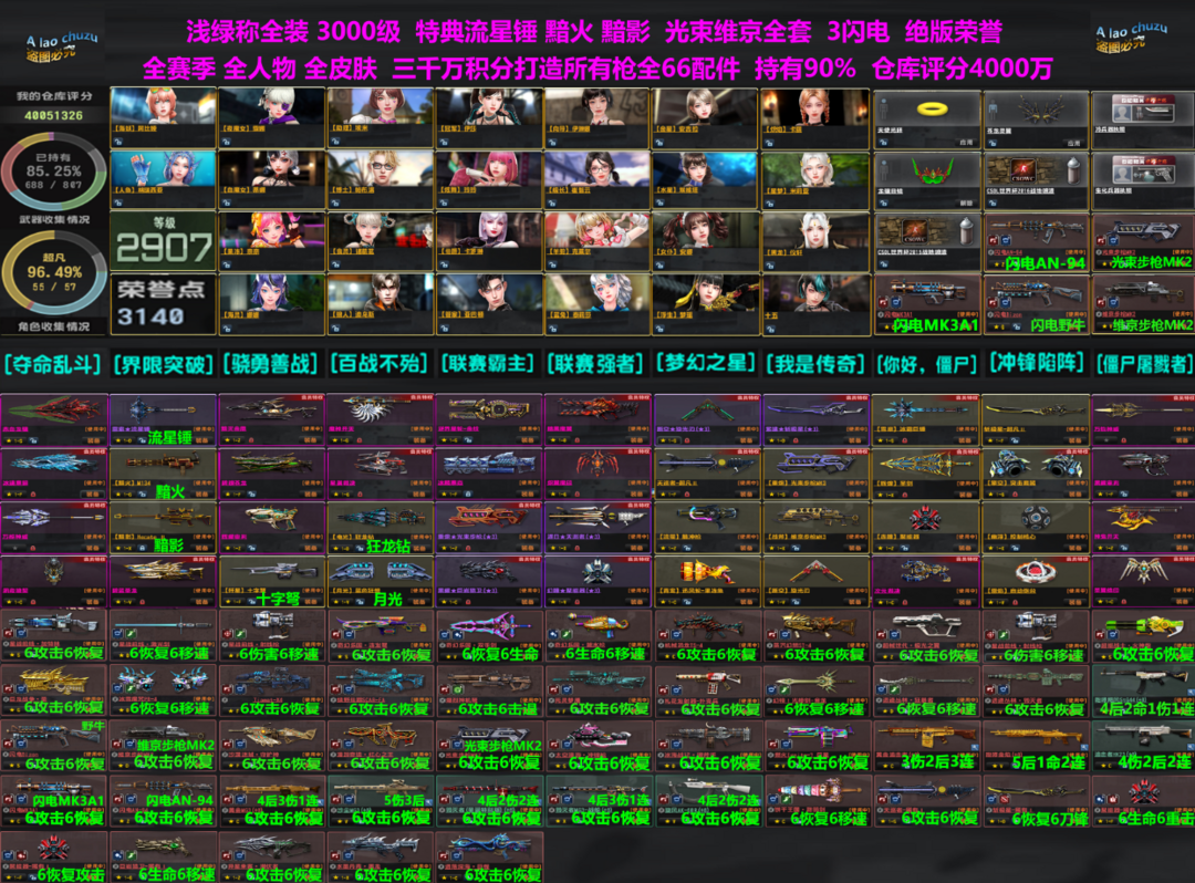 电二绿称号,3000级,荣誉3100点,很多绝版荣誉。紫钻特权全武器。光束步枪123、维京步枪全套、3闪电(闪电MK3A1、闪电野牛、闪电94)。雷索-流星锤、黯火、特典狙-黯影、狂龙钻、月光蓝色幻想、歼星十字弩。全赛季。超多皮肤枪。极品强化。三千万积分打造顶级配件 A佬出租欢迎你的光临!喜欢请收藏店铺,店铺里下单可领红包。 【已去黑雾,画面优化,画质清晰。【欢迎收藏】