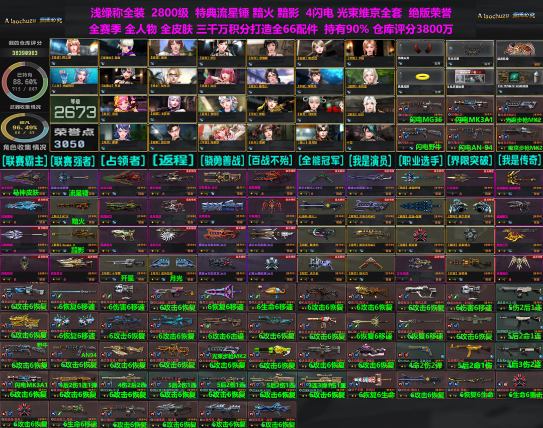 网一浅绿称,2800级。荣誉3050点,紫钻特权全武器。很多绝版荣誉称号。马神皮肤、光束步枪123、维京步枪全套、闪电MG36、闪电MK3A1、闪电野牛、AN94。7保底(雷索流星锤、黯火、特典狙-黯影、月光蓝色幻想、歼星十字弩、日冕加特林、煌炎X12)。23个赛季全满。全人物。超多皮肤枪。持有90%,仓库评分3700万,极品强化。3千万积分打造顶级配件。 【已去黑雾,画面优化,画质清晰。【欢迎收藏】