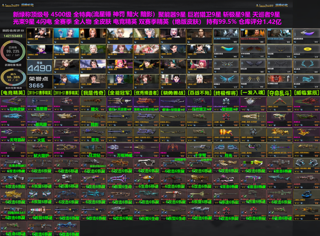 电一超超极品。浅绿色称全装号。4500级,荣誉3700点,很多绝版荣誉,绝版皮肤绝版称号。电竞精英、2018和2019赛季精英。全神全霸全传奇。马神皮肤、万钧神威EX皮肤。金鸡、巨岩猎卫+9,斩极星+9,天巡者全套+9,光束全套+9、维京全套、3闪电、全保底,雷索流星锤、神罚暴风眼、火狐、狱火熔炉、黯火、恶龙、黯影、狂龙钻等、全赛季。全人物。全部皮肤枪。满灾变插件。武器持有99%,人物持有98.5%,仓库评分1.42亿,绝版武器,绝版武器,绝版三太子、晶石巨像、晶石魔像、胜利之翼、排位赛霸主动态喷漆。顶级属性强化。5000万积分打造顶级配件。