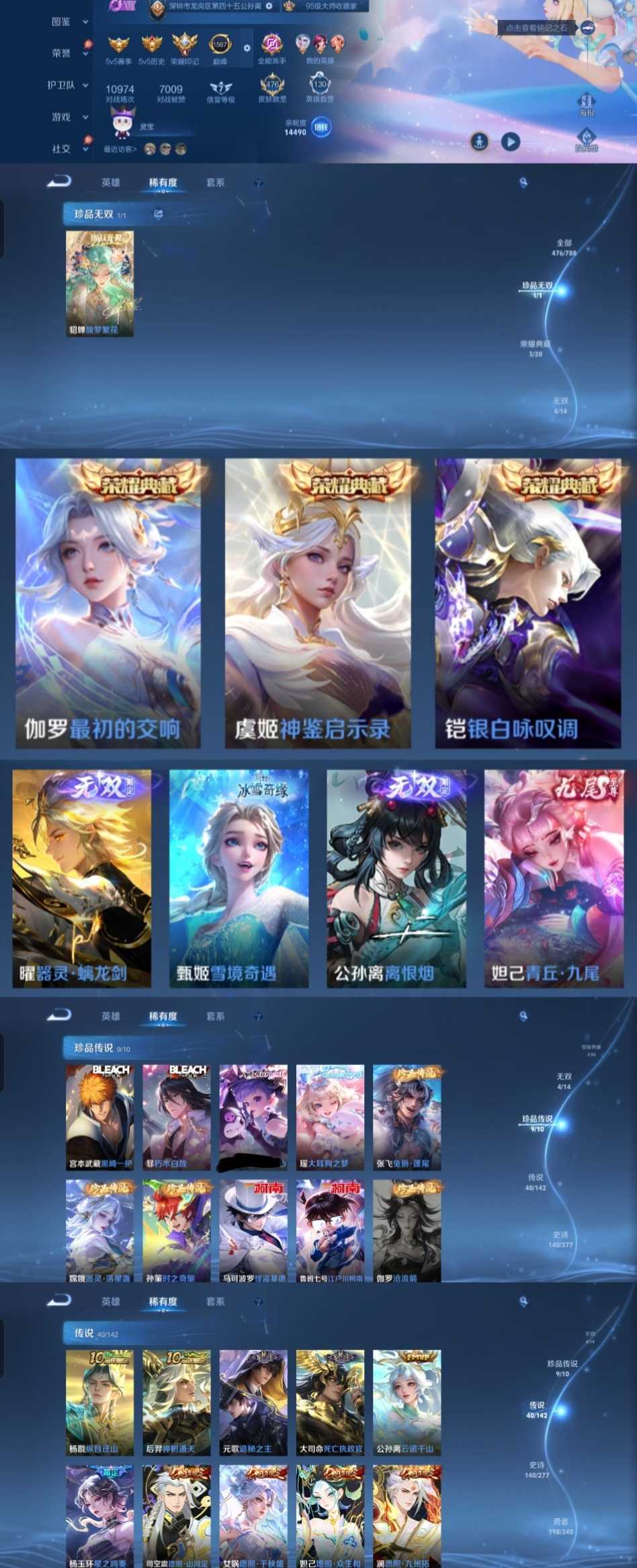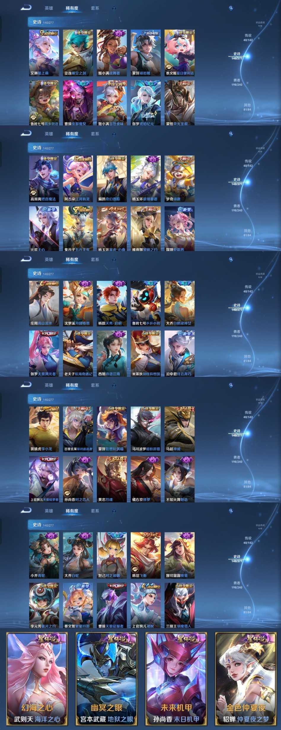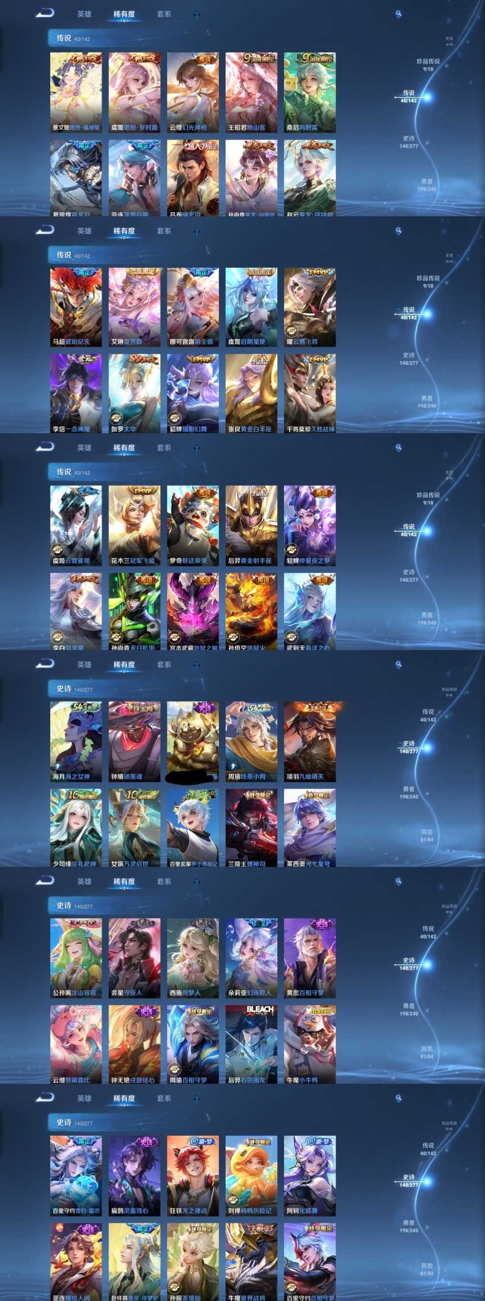 该号英雄130个皮肤476个,珍品无双1个,典藏3个,无双4个,珍品传说9个,星传说4个,传说40个,史诗140个,祝你游戏愉快~