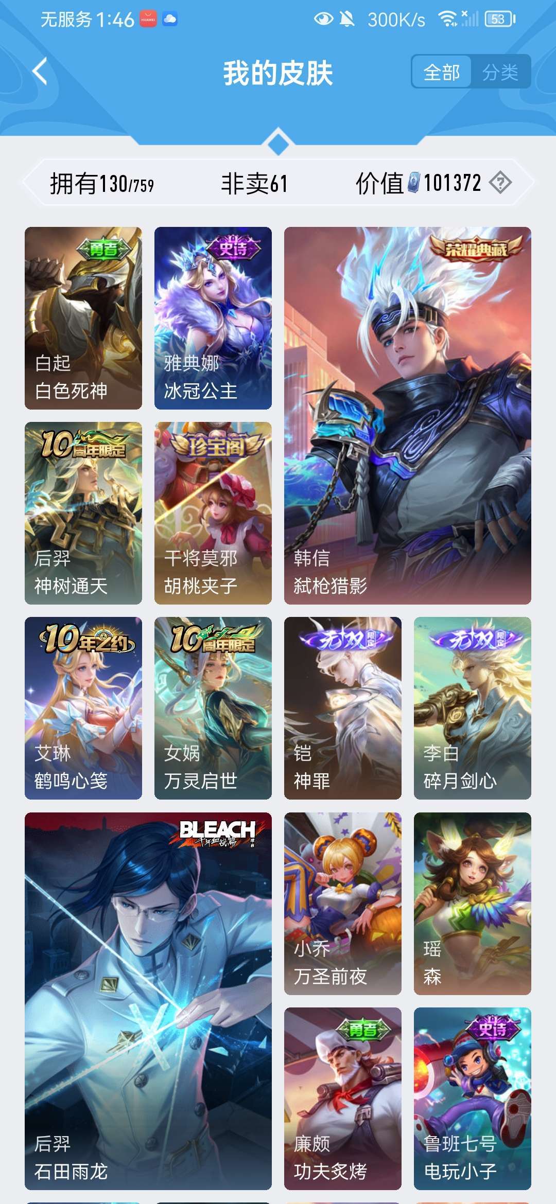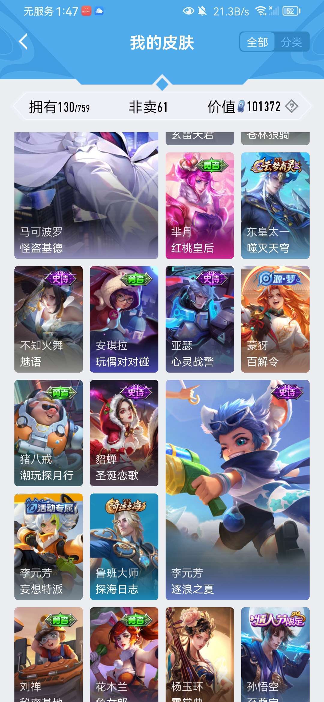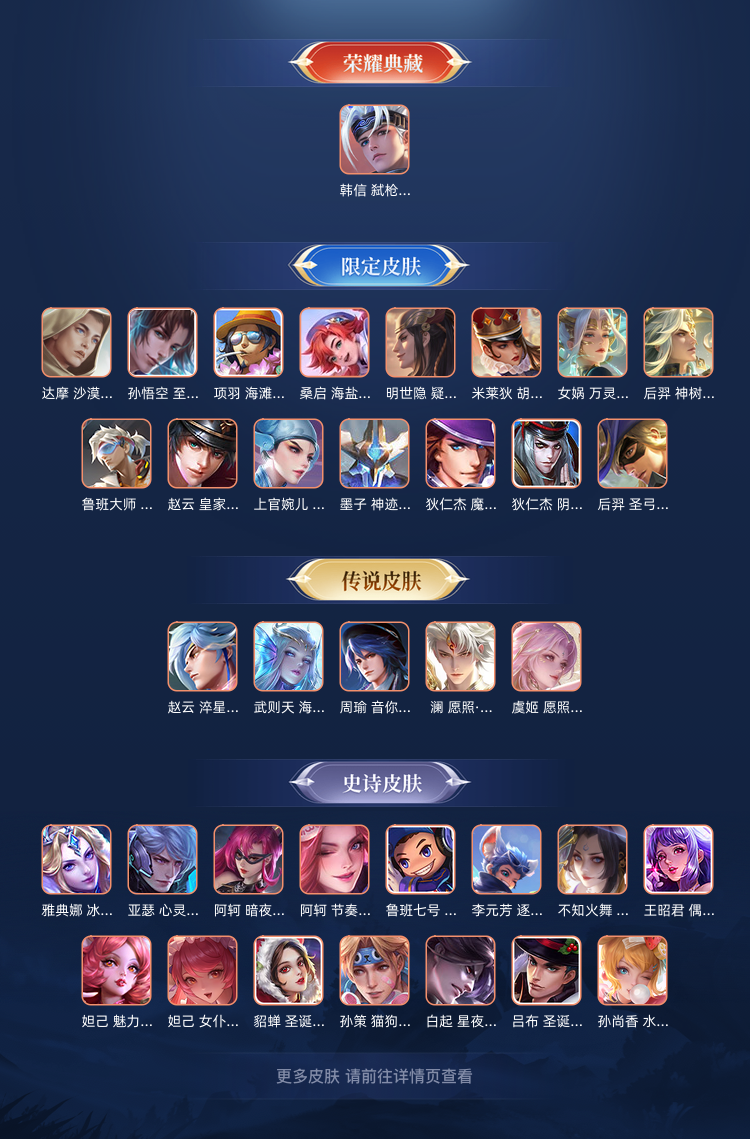 韩信典藏,凯、曜、李白无双,马克基德,澜、虞姬年限,还有一些其他传说皮,限定皮