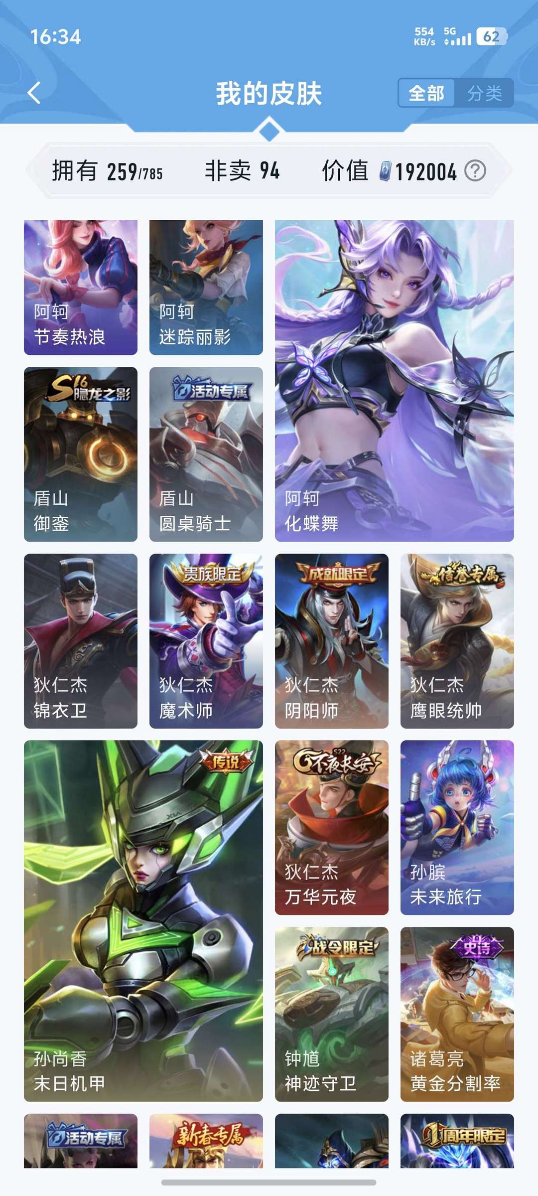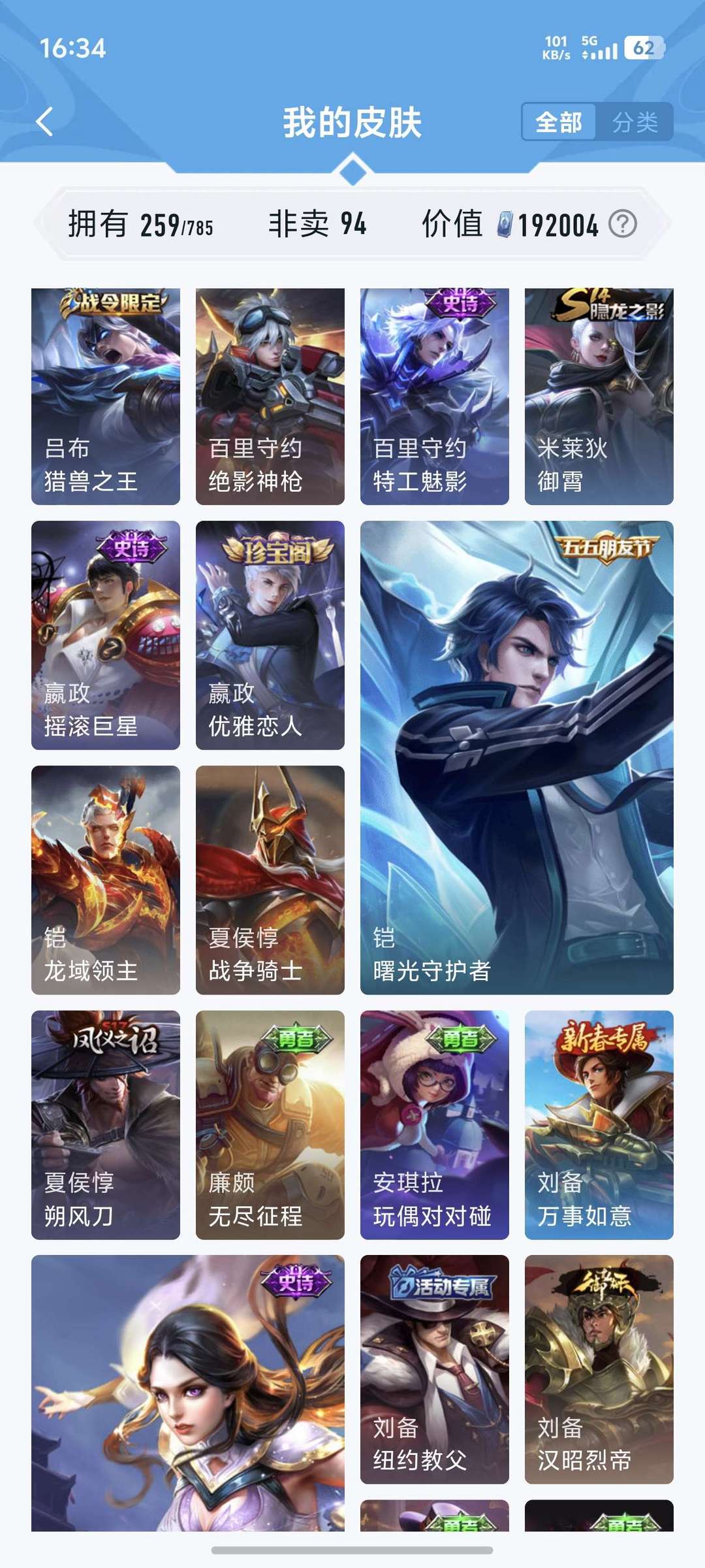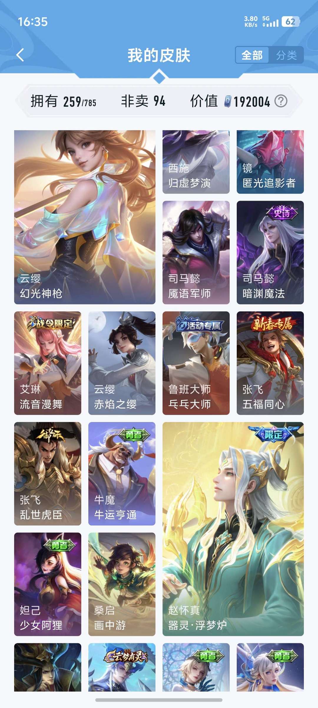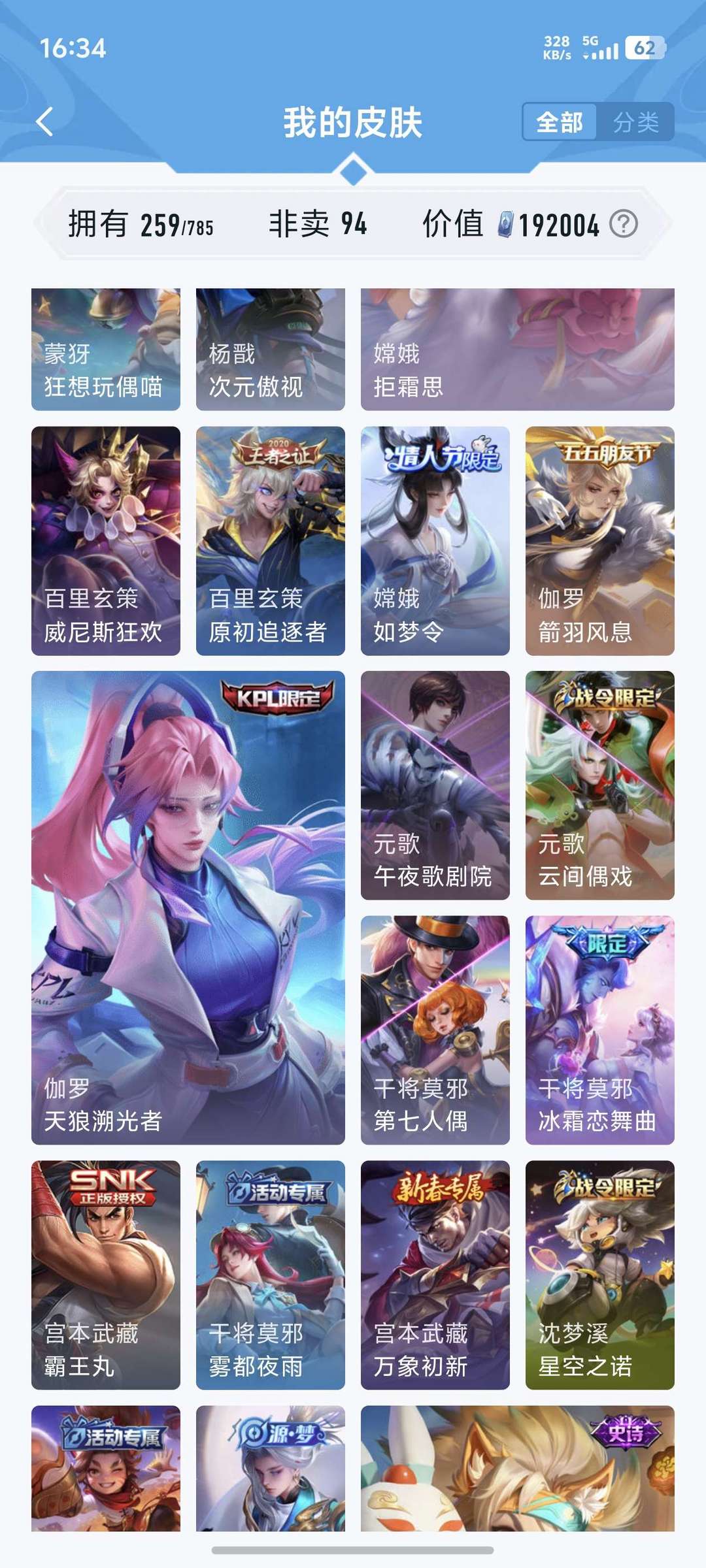 喜欢本账号请点 ☆收藏☆ 方便下次租用,谢谢光临惠顾!皮肤数:259款,含94款非卖限定,总价值19万 点券