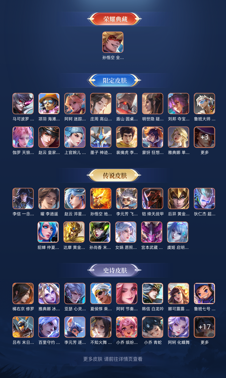 典藏1 传说22 史诗64 限定64 英雄127 皮肤230 可排位 皮肤价值:178816
