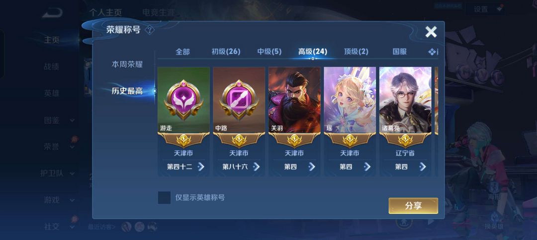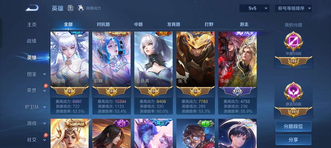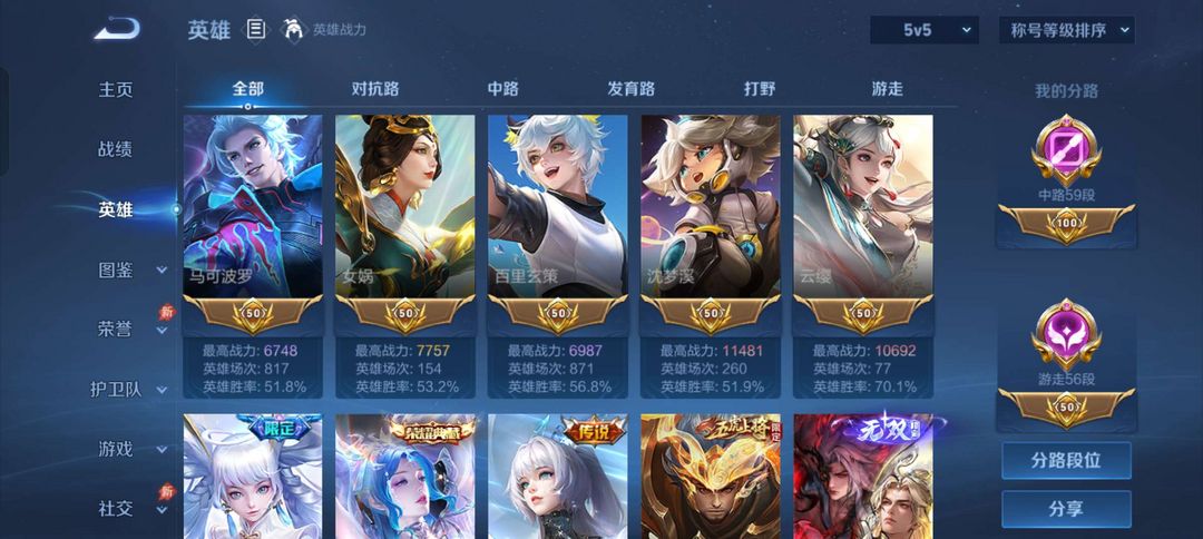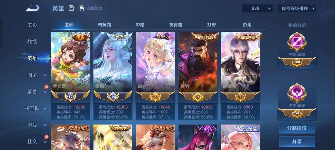 金标万战快20多个,中路打野辅助都快60段,对抗和射手应该也有30段左右,万战有十几个,巅峰最高2400多分,极品男神女神号,背包里还有一颗荣耀水晶切勿动用,否则将追究责任