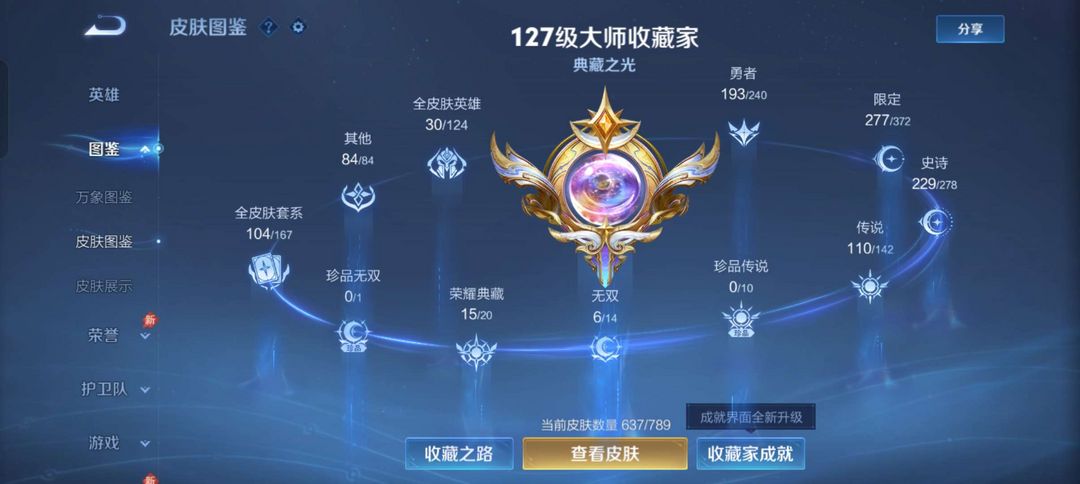 16典藏六无双110传说640个皮肤,1万六国服露娜国服蔡文姬,还有20多个金标,中野辅都60段左右