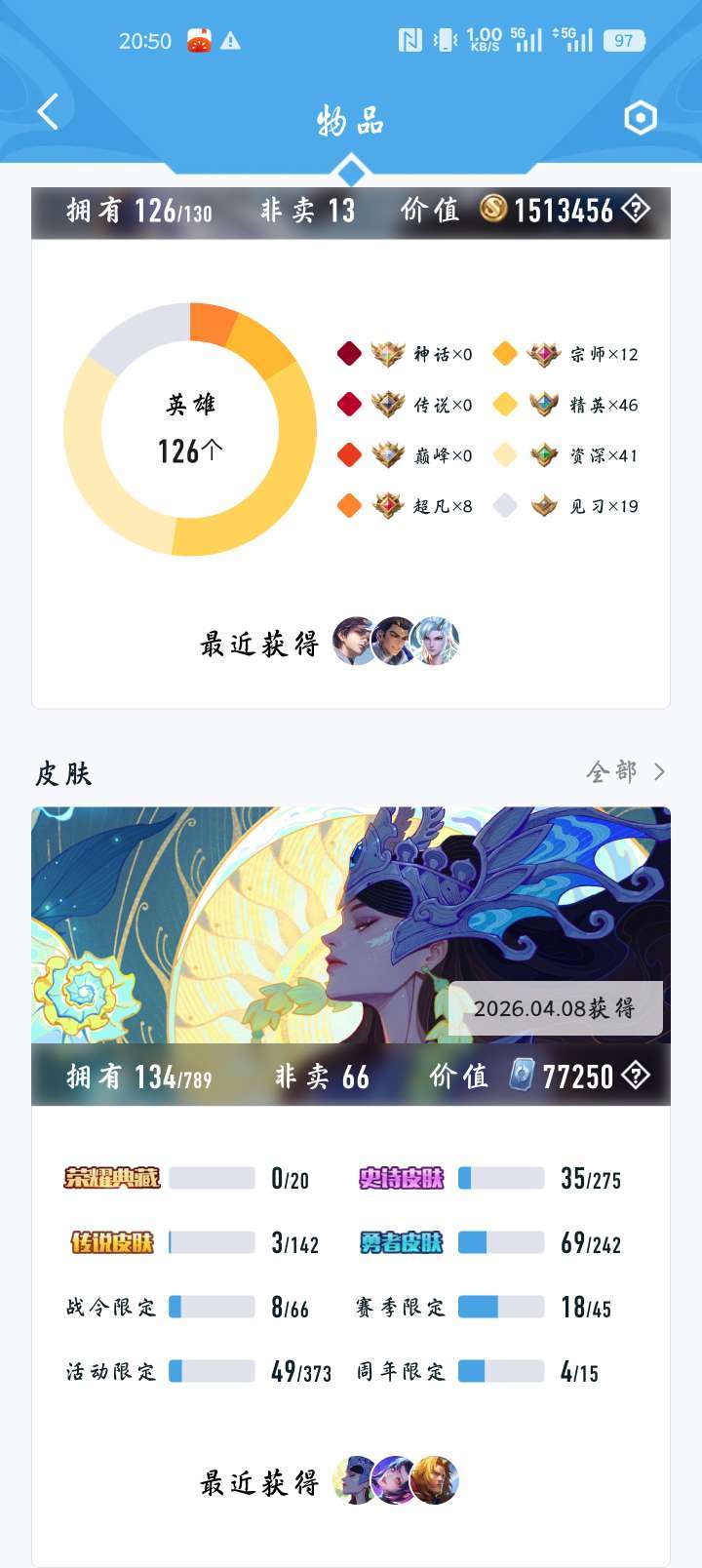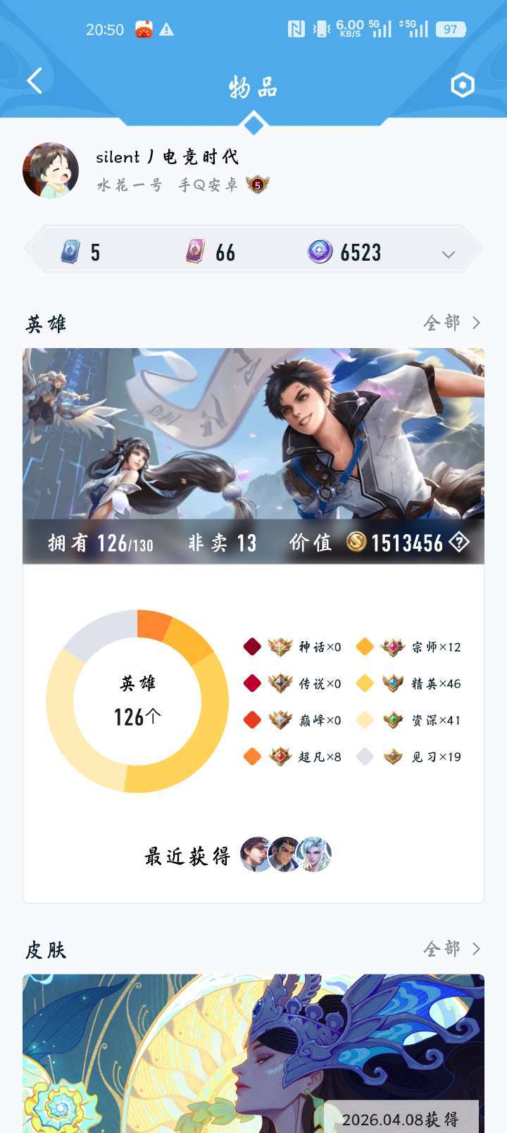 126款英雄,至尊宝凤求凰等多种特效好皮爽玩,150满铭文