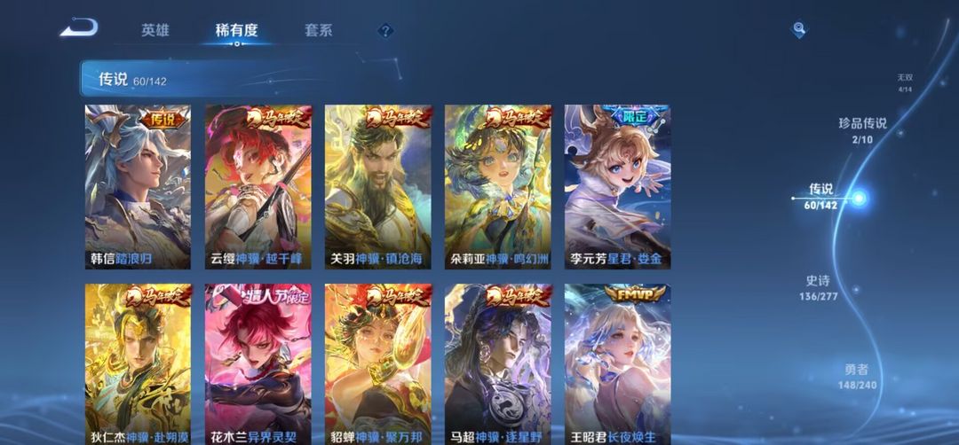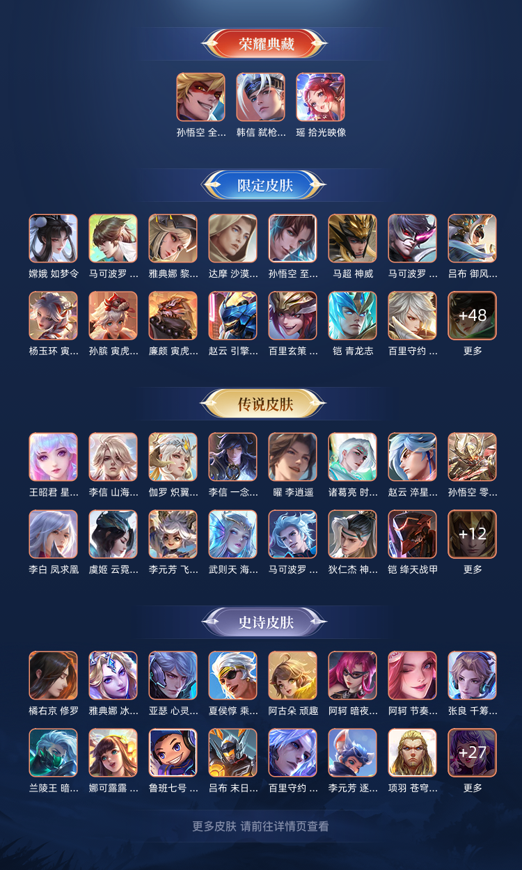 v10历史荣耀 422皮4水(瑶信悟)4无双(信离乔妲)2珍品马可伽罗 60传多热门限定皮 5星传 新皮居多