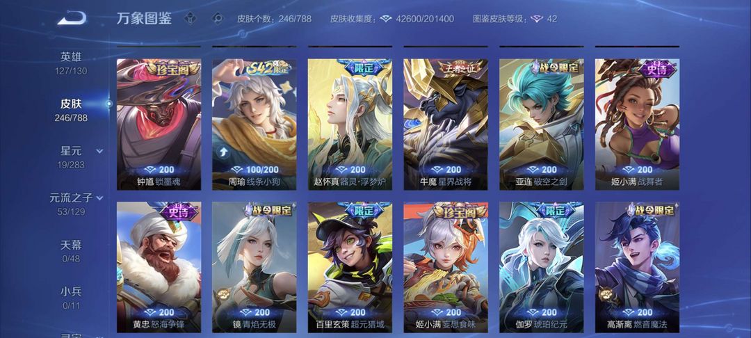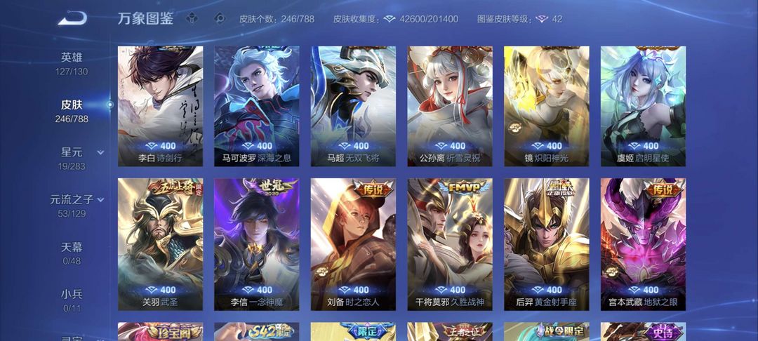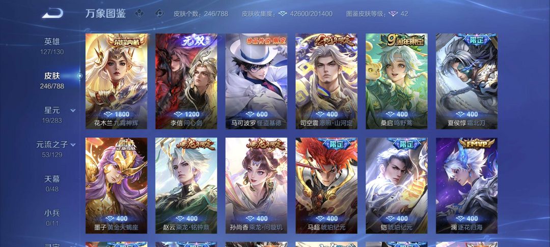 246款皮肤厄限定很多有 怪盗基德 祈雪灵祝 李信的无双 花木兰的荣耀典藏 可打排位 可加好友 不毁号不开柜的诚心来 可长期租