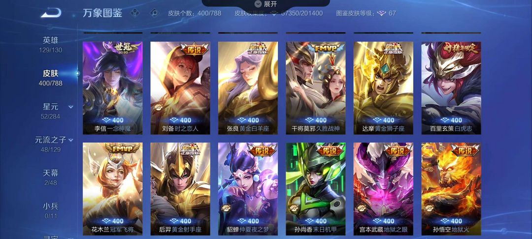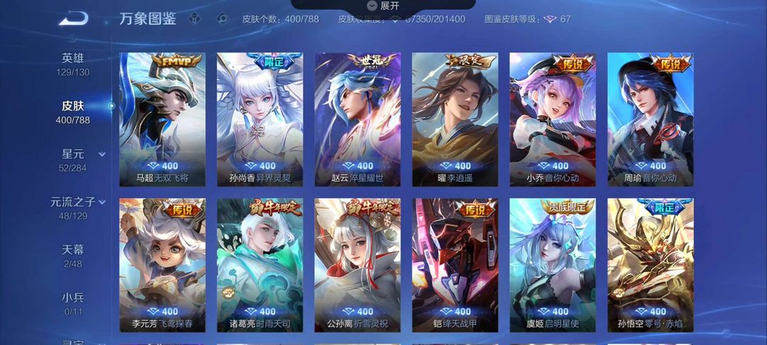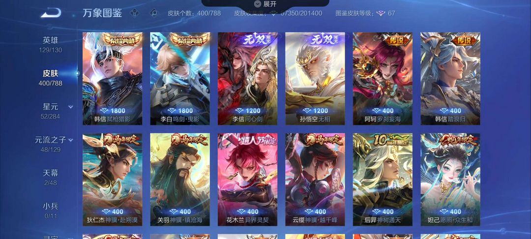 看清楚在下单v9 400皮肤2荣耀典藏李信无双孙悟空无双花木兰新皮肤各种各种皮肤基本上都有。