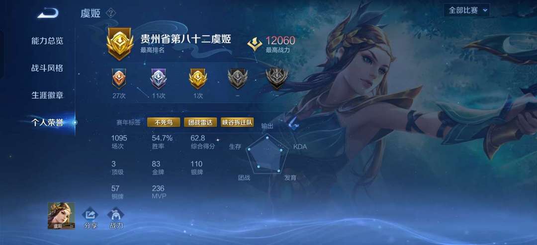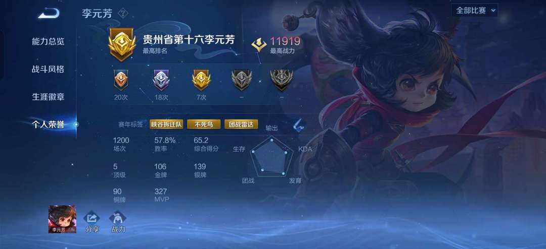 高玩号,省级虞姬李元芳,最高战力一万二